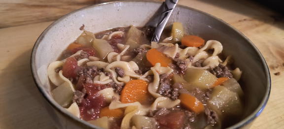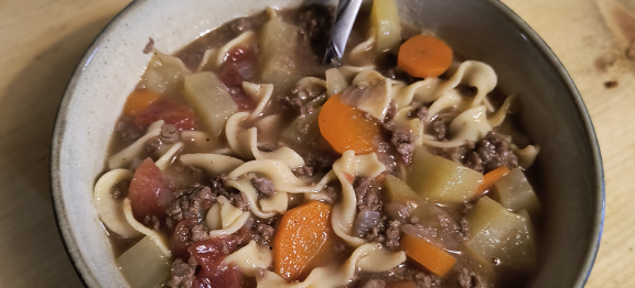 Brown hamburger and onions together in dutch oven drain off grease. Dice potatoes and carrots and set aside.